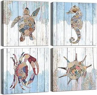 WANBOYA ウミガメ ウォールアート タツノオトシゴ アートワーク カニ コンク キャンバスプリント 海の動物 木目 壁装飾 4ピース カラフルレトロプリント写真 バスルーム 寝室 キッチン フレーム入り 16インチ x 16インチ x 4個